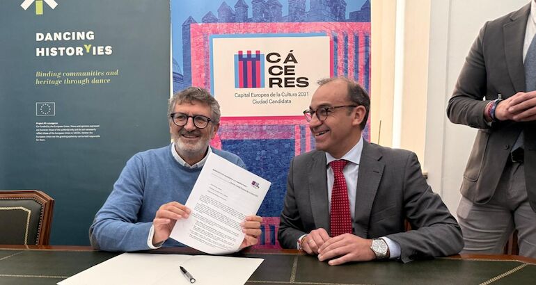 De esta forma, se ha ratificado con la firma de adhesión durante un acto con la presencia del alcalde de la capital cacereña, Rafa Mateos; el gerente del Festival de Mérida, Pedro Blanco; y la presidenta del Clúster de Turismo de Extremadura, María José García Curto, entidad a través de la cual se ha cosechado el apoyo de Dancing Histor(y)es.